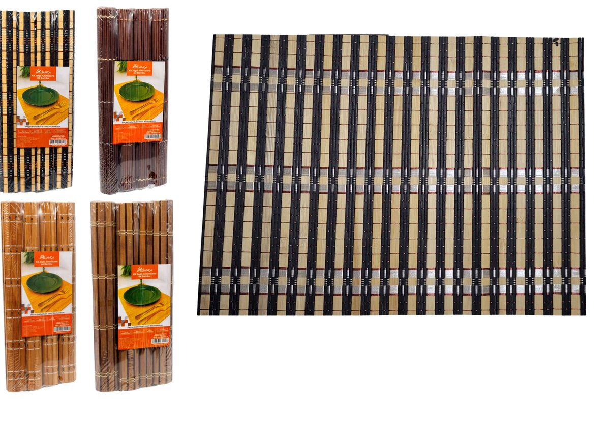 O 'Jogo Americano Bambu Preto Listrado é a escolha perfeita para quem busca elegância e praticidade em suas refeições. Feito de bambu e fio de nylon, este jogo americano é durável, fácil de limpar e não amassa, garantindo uma longa vida útil. Com um design listrado em preto, ele adiciona um toque de sofisticação à sua mesa, seja na cozinha, sala ou qualquer ambiente de refeição, tornando-o leve e fácil de manusear. A marca Alianca é sinônimo de qualidade e estilo, e este modelo retangular não é exceção. Ideal para quem valoriza tanto a estética quanto a funcionalidade.CORES SERÃO ENVIADAS ALEATÓRIAMENTE